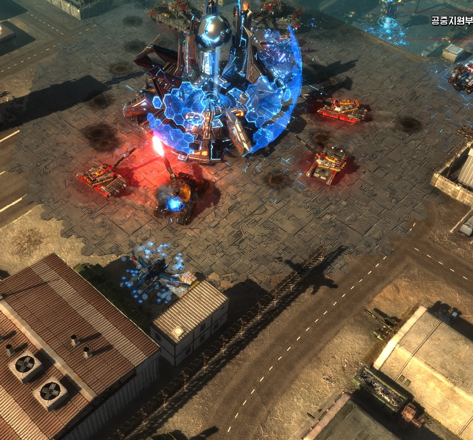 끊임없는 인간들의 공격 물량에 조금씩 소모되는 외계인의 거점 기지 하베스터 방어막.